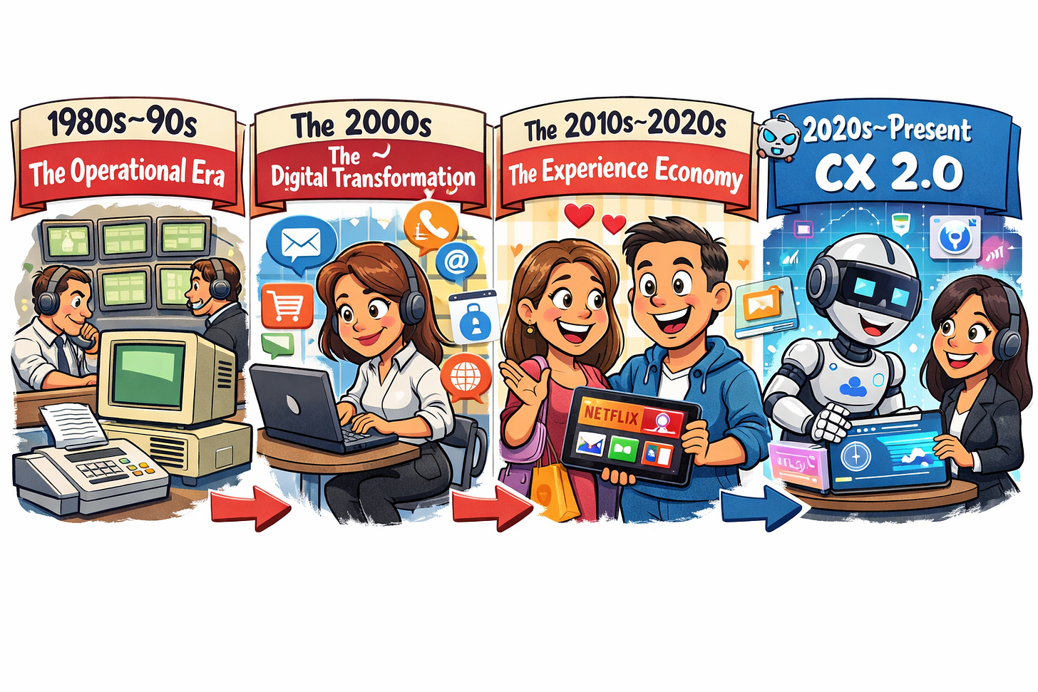 📠 The 1980s–90s: Efficiency First. Early CX was basically a stopwatch exercise. How fast can we answer the phone? How quickly can we close a ticket? Metrics like wait times, handle times, and first-contact resolution (FCR) ruled the day. The goal was managing operational service efficiently, not crafting an experience.